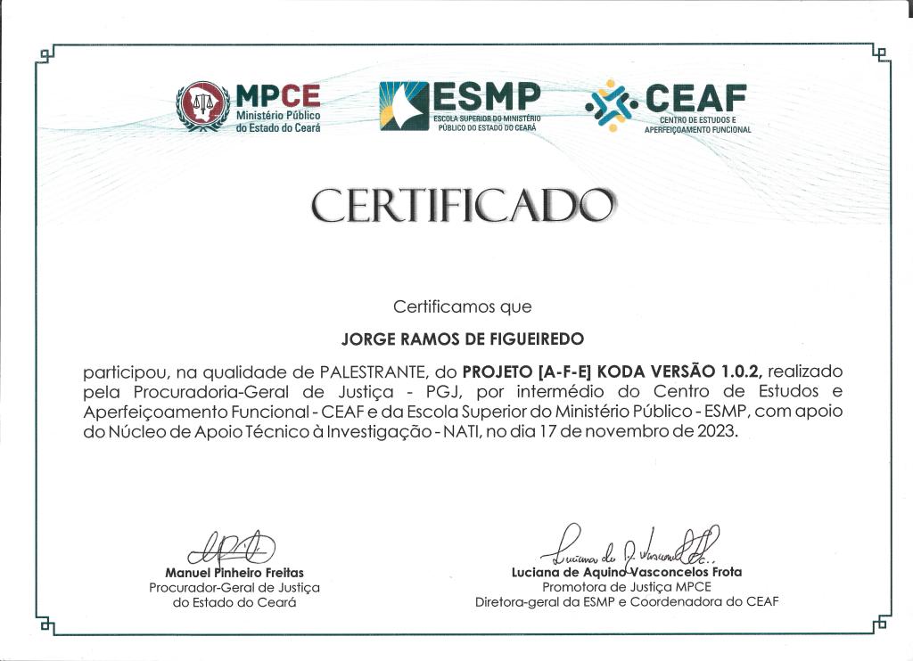 Foi realizada em 2023, uma capacitação ao uso do sistema AFE-KODA via Escola Superior do Ministério Público do Estado do Ceará, quando ainda na versão 1.0.2
