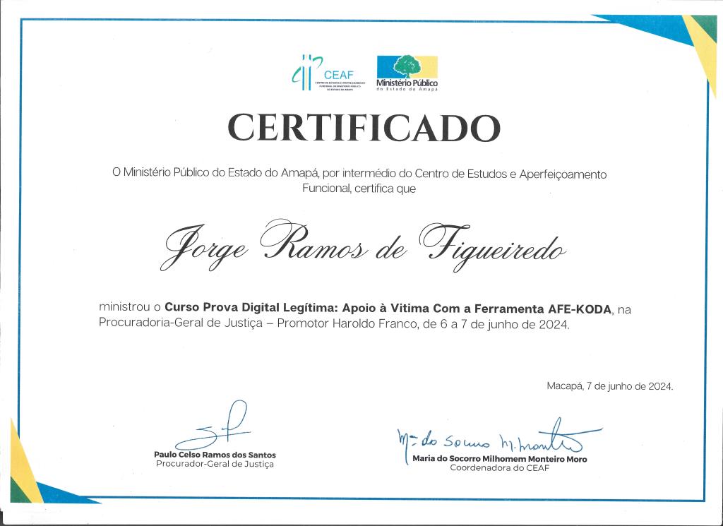 Curso de capacitação oficial da ferramenta AFE KODA versão 1.0.6 realizado pelo Ministério Público do Estado do Amapá, nos dias 06 e 07 de junho de 2024. O Koda está sendo estudado e aplicado como uma metodologia de coleta de dados por agentes da Lei daquele Estado.