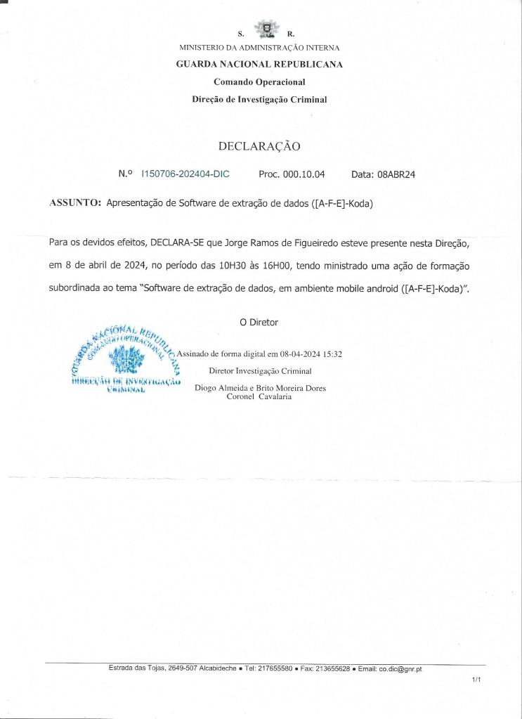 Declaração Proferida pelo Excelentíssimo Sr. Diogo Almeida, Coronel de Cavalaria GNR, Diretor de Investigação Criminal, em face da capacitação ministrada aos policiais da GNR e da PSP presentes ao evento.