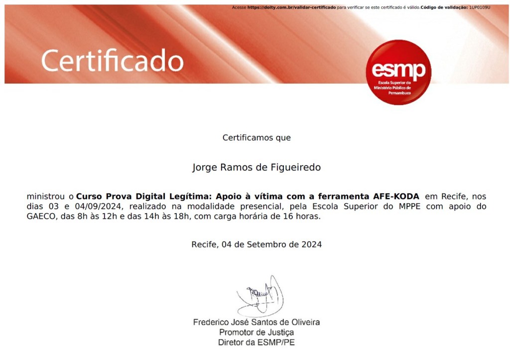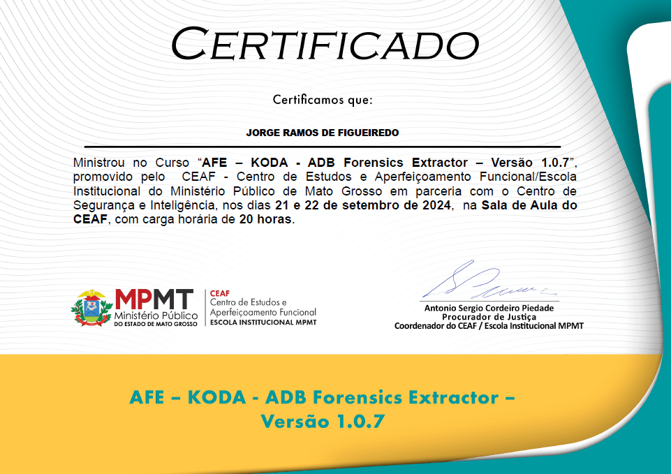 Curso de capacitação oficial da ferramenta AFE KODA versão 1.0.7 realizado pelo Ministério Público do Estado de Pernambuco em setembro 2024. Havendo a participação de Peritos Criminais oficiais do Estado, Promotores de Justiça, Analistas do Ministério Público, Auditores da Secretaria do Estado de Fazenda, Policiais da Polícia Judiciária Civil e Peritos do Ministério Público Federal.